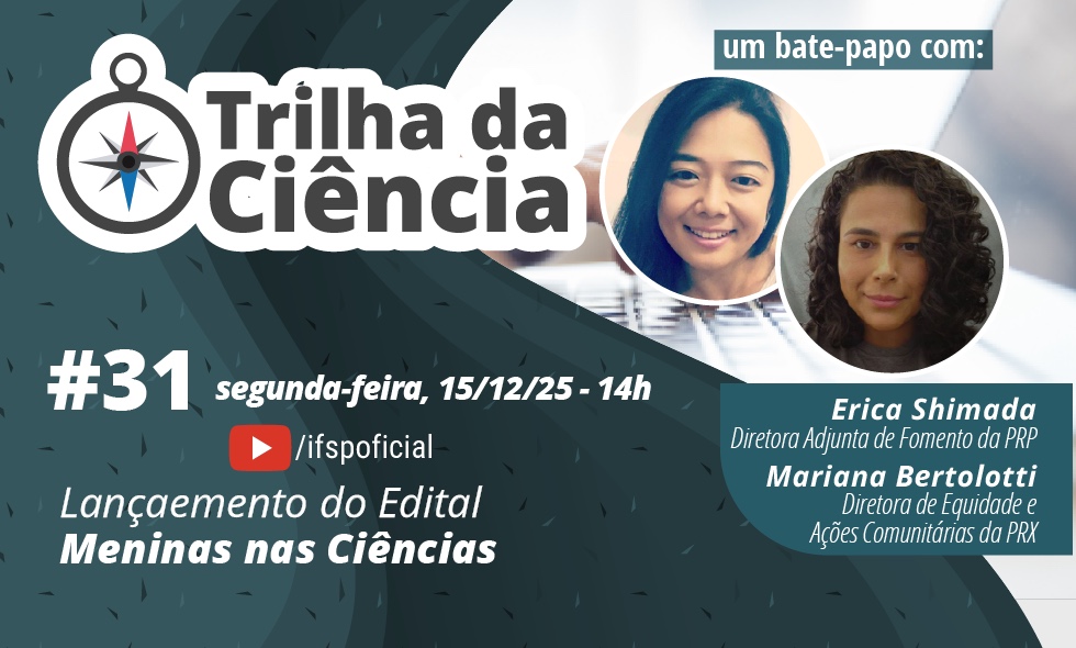 O IFSP publicou o Edital n.º 267/2025 - Edital de incentivo às “Meninas nas Ciências”, que destina R$ 188 mil para fomentar até quatro projetos voltados à articulação entre pesquisa, ensino, extensão e inovação, com o objetivo de incentivar a participação feminina nas áreas STEM (Ciências, Tecnologias, Engenharias e Matemática).