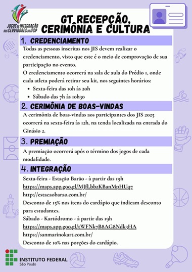 IFSP abre chamada pública para apoio à realização dos Jogos de Integração dos Servidores 2025 - Publicado: Quinta, 28 de agosto de 2025, 12h51